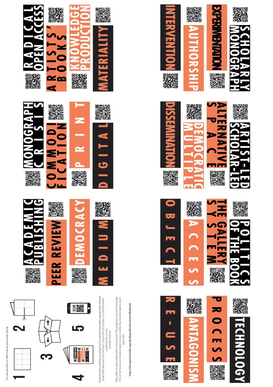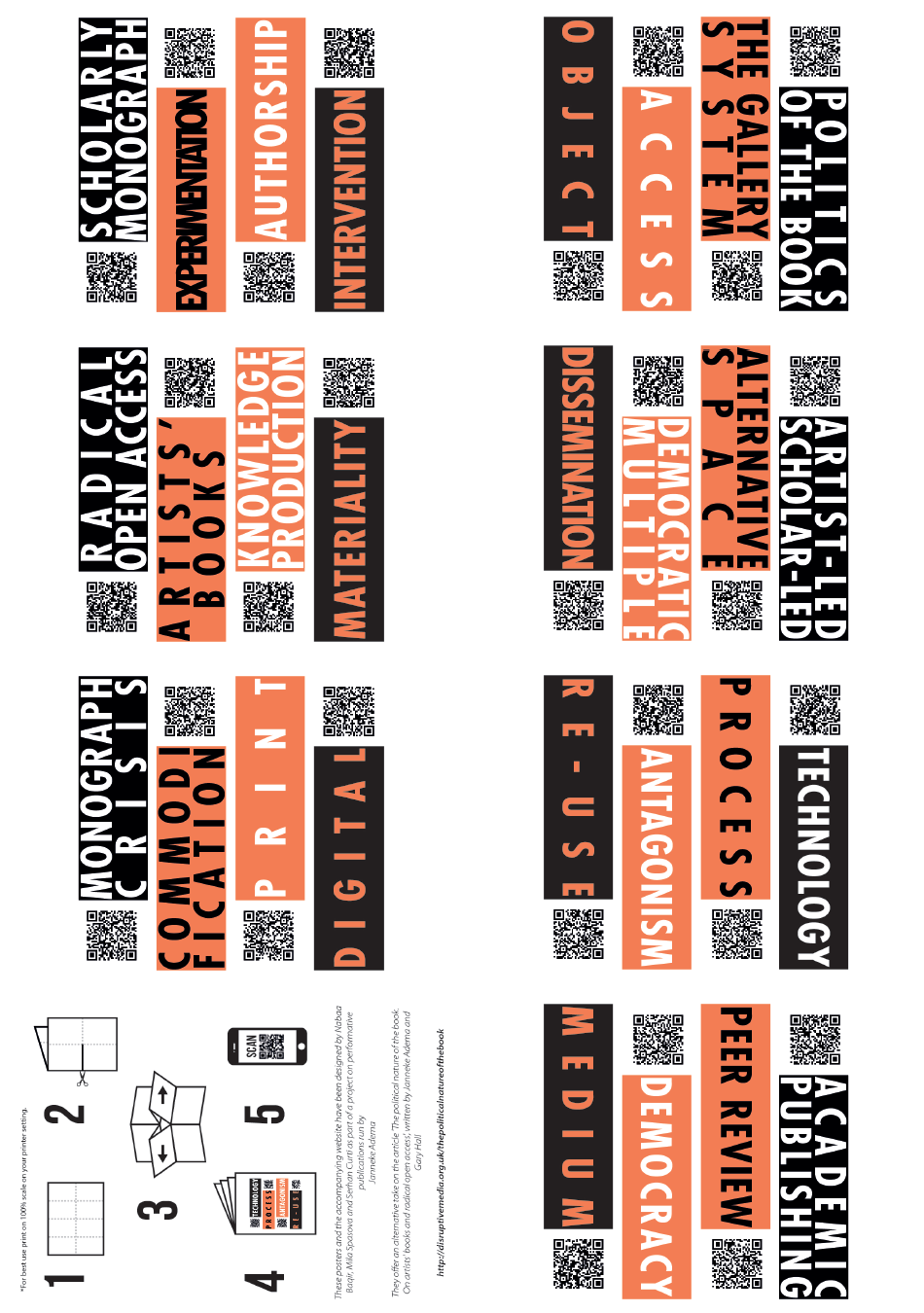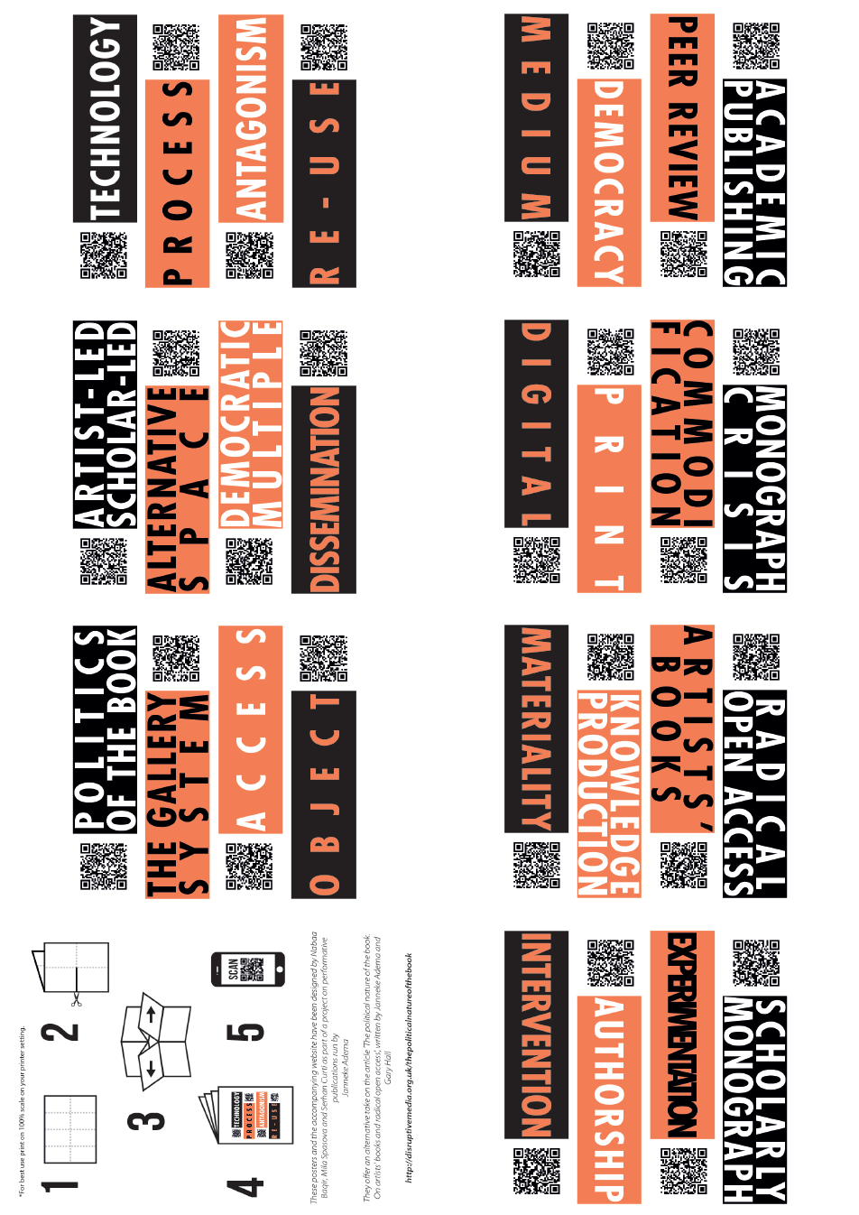 Underneath you can find 7 posters that can be printed off at home, each with 4 keywords and 4 QR codes. The QR code for each keyword will direct the reader to the corresponding keyword here on the website, offering the availability to access the various text snippets through your mobile devices. The posters can be printed on A3 or A4 format, which makes them easy to access with the aid of a home printer and simple to disseminate. On the backside of each poster you can find all the 7 separate posters in a reduced size with the accompanying keywords and QR codes. The poster can be folded in such a way (see the folding instructions) that it forms a little booklet consisting of all the posters, via which the entire article can be accessed in an alternative way.