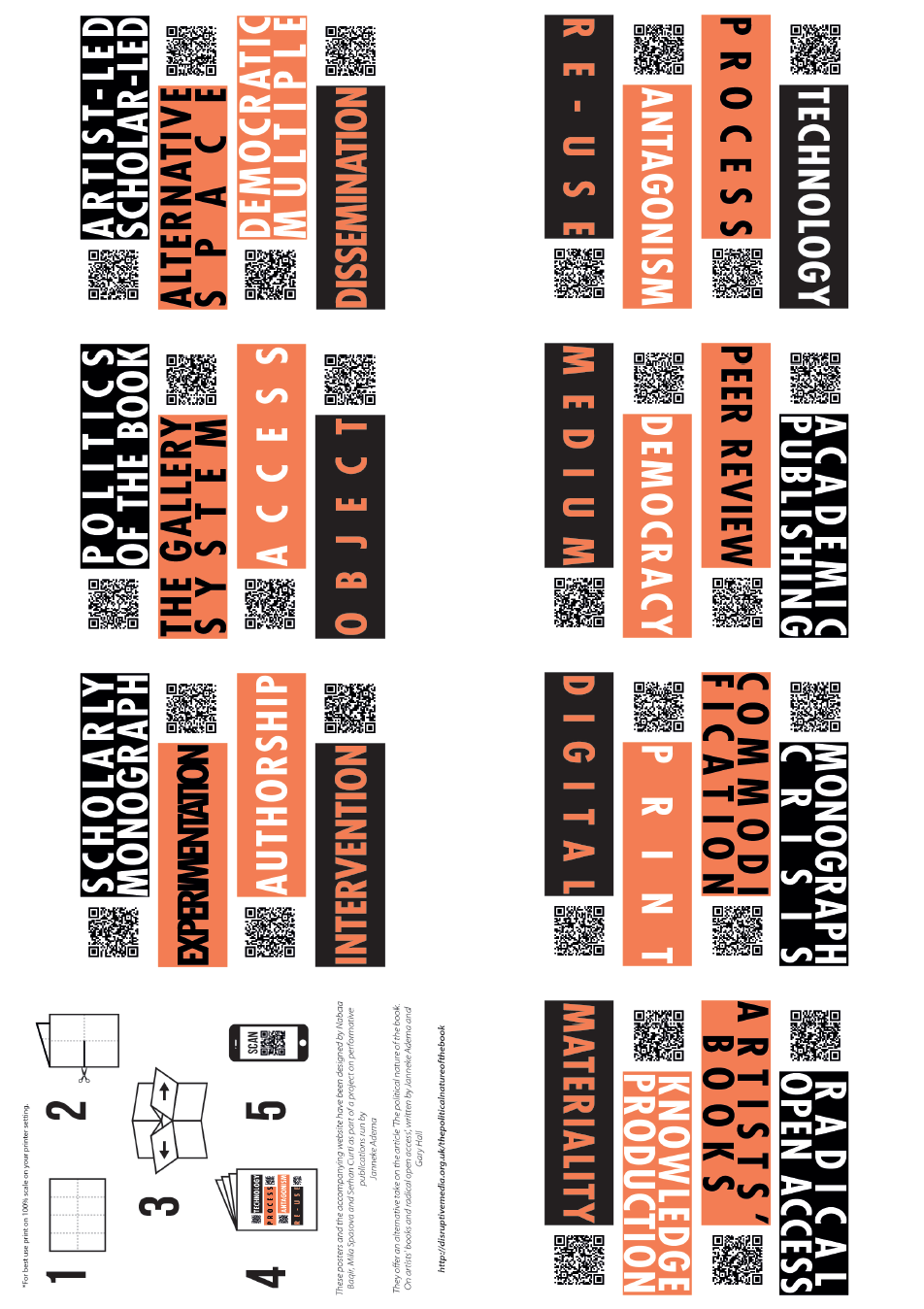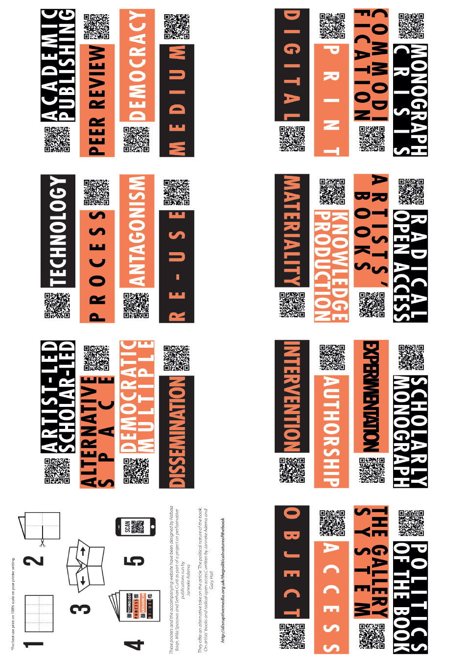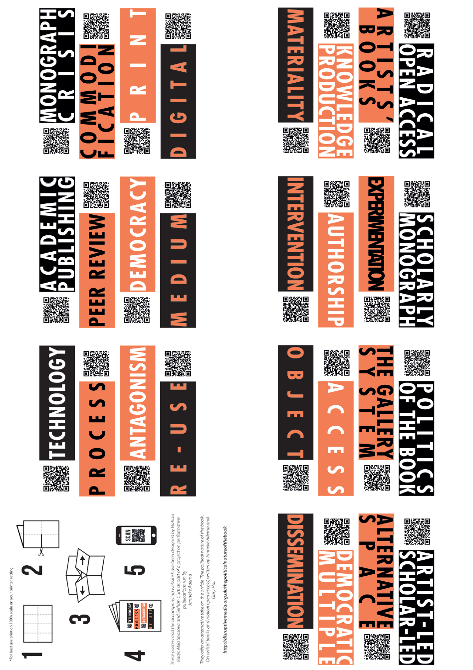 Underneath you can find 7 posters that can be printed off at home, each with 4 keywords and 4 QR codes. The QR code for each keyword will direct the reader to the corresponding keyword here on the website, offering the availability to access the various text snippets through your mobile devices. The posters can be printed on A3 or A4 format, which makes them easy to access with the aid of a home printer and simple to disseminate. On the backside of each poster you can find all the 7 separate posters in a reduced size with the accompanying keywords and QR codes. The poster can be folded in such a way (see the folding instructions) that it forms a little booklet consisting of all the posters, via which the entire article can be accessed in an alternative way.